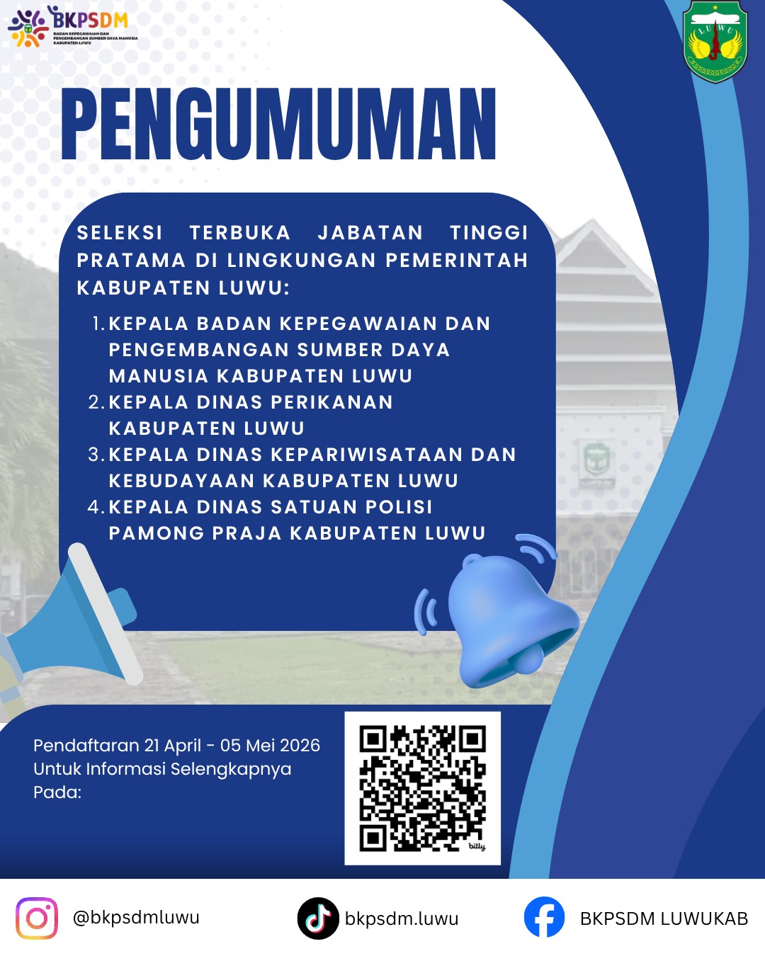 Dalam rangka pengisian Jabatan Pimpinan Tinggi Pratama di lingkungan Pemerintah Kabupaten Luwu, sesuai dengan Undang-Undang Nomor 20 Tahun 2023 tentang Aparatur Sipil Negara, Peraturan Pemerintah Nomor 11 Tahun 2017 jo. Peraturan Pemerintah Nomor 17 Tahun 2020 tentang Manajemen Pegawai Negeri Sipil dan Peraturan Menteri Pendayagunaan Aparatur Negara dan Reformasi Birokrasi Nomor 15 Tahun 2019 tentang Pengisian Jabatan Pimpinan Tinggi Secara Terbuka dan Kompetitif di Lingkungan Instansi Pemerintah, dengan ini kami mengundang Pegawai Negeri Sipil yang telah memenuhi syarat untuk mendaftarkan diri melalui seleksi terbuka dengan ketentuan sebagai berikut: